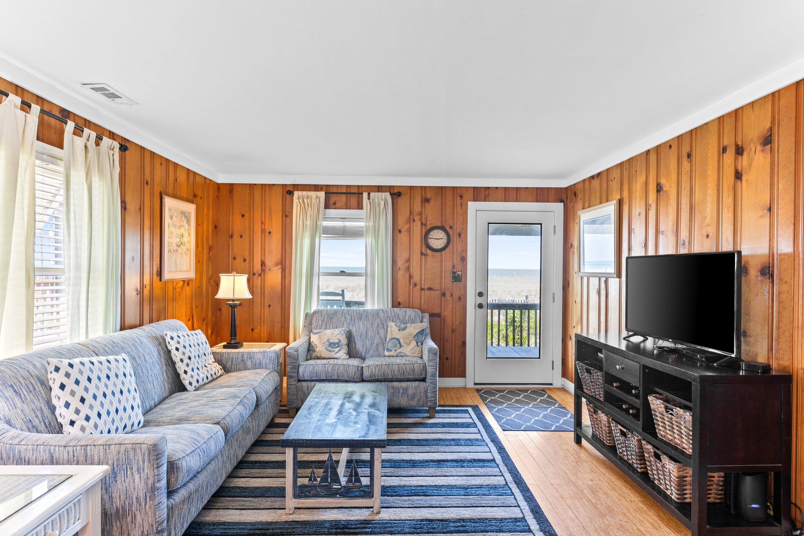 | ✨ Newly Renovated New flooring, furniture, walkway, outdoor shower, windows, beach accessway, covered deck, and fresh paint for a clean, modern look. The ground floor layout has been opened up to make it light, comfortable, and inviting. | 🎬 The Surf Shack Theater With a new 85-inch TV and surround sound system, plus a new sectional couch with comfortable seating for at least 9, the ground floor open area is nicknamed The Surf Shack Theater! |