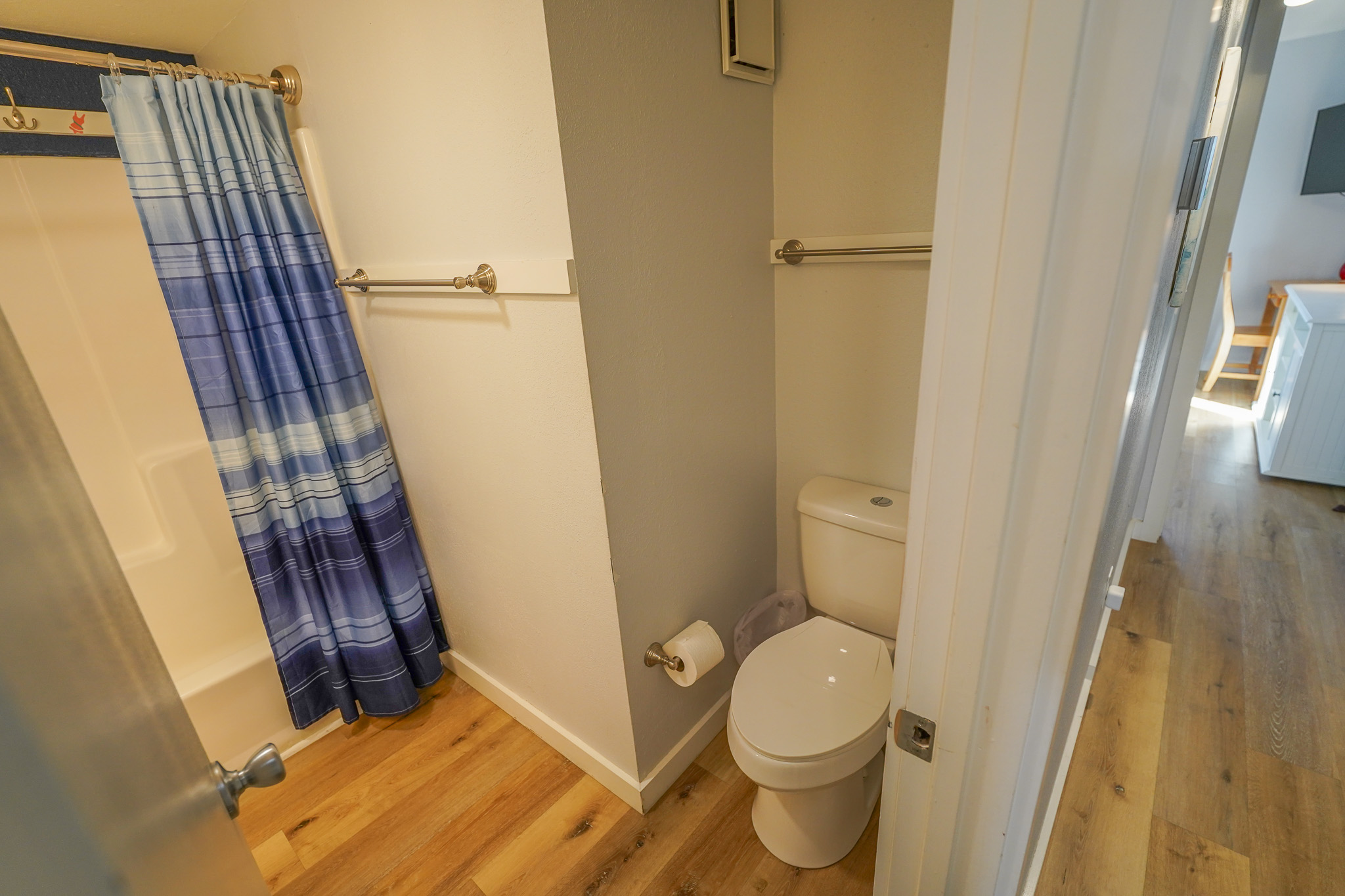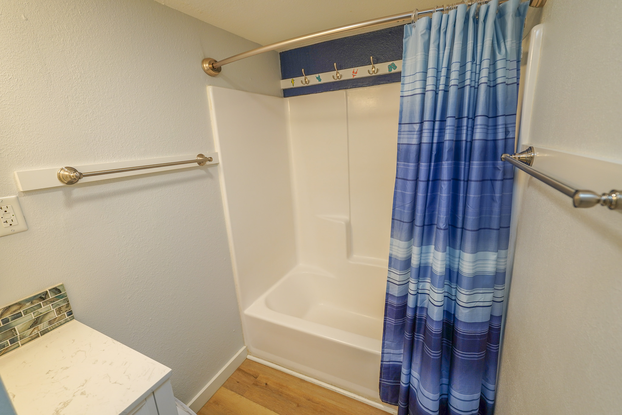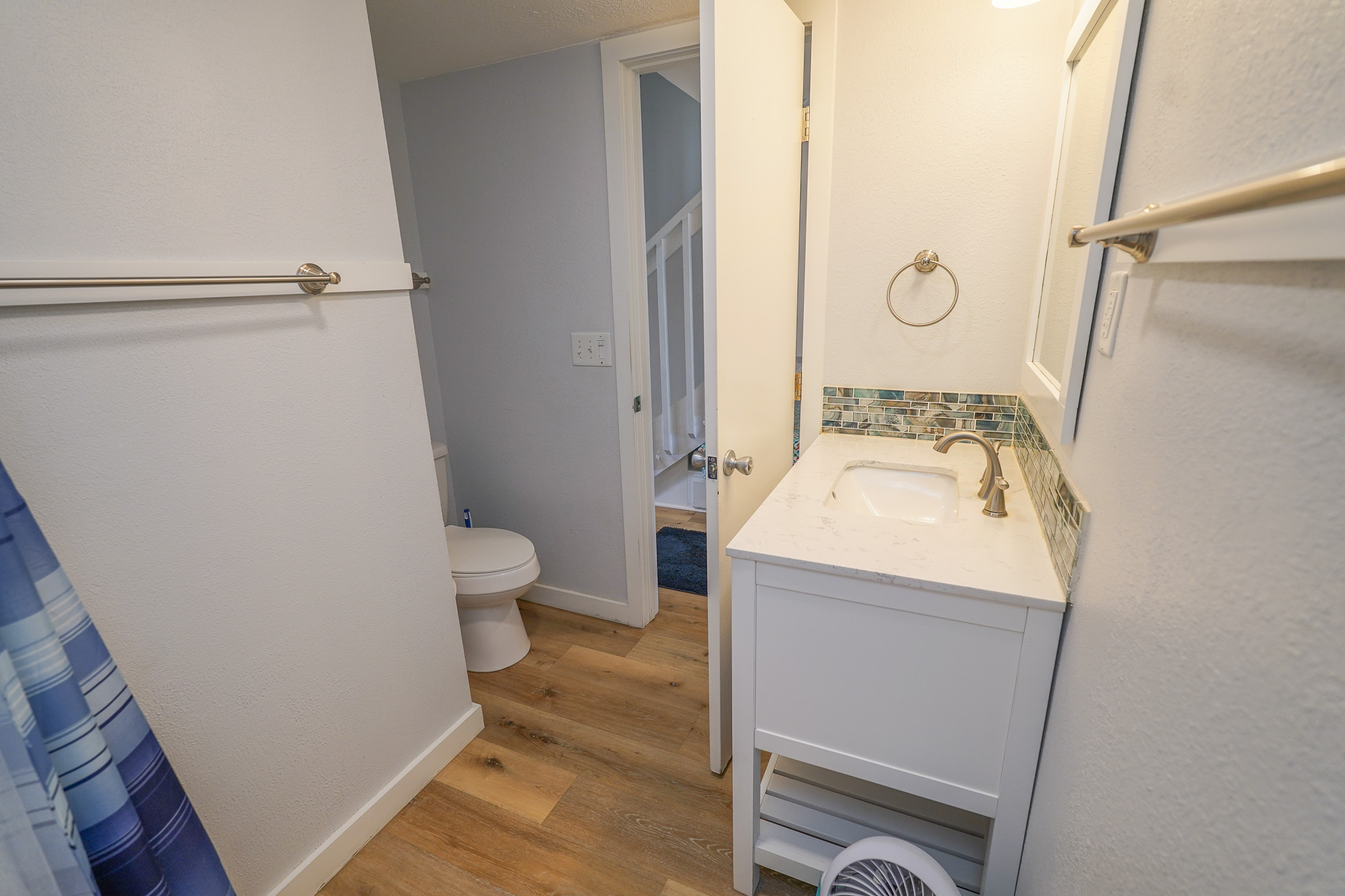 Total Sleeping Capacity: 8 guests | Bathrooms: 2 full bathrooms with showers, vanities, and extra hooks for wet swimsuits