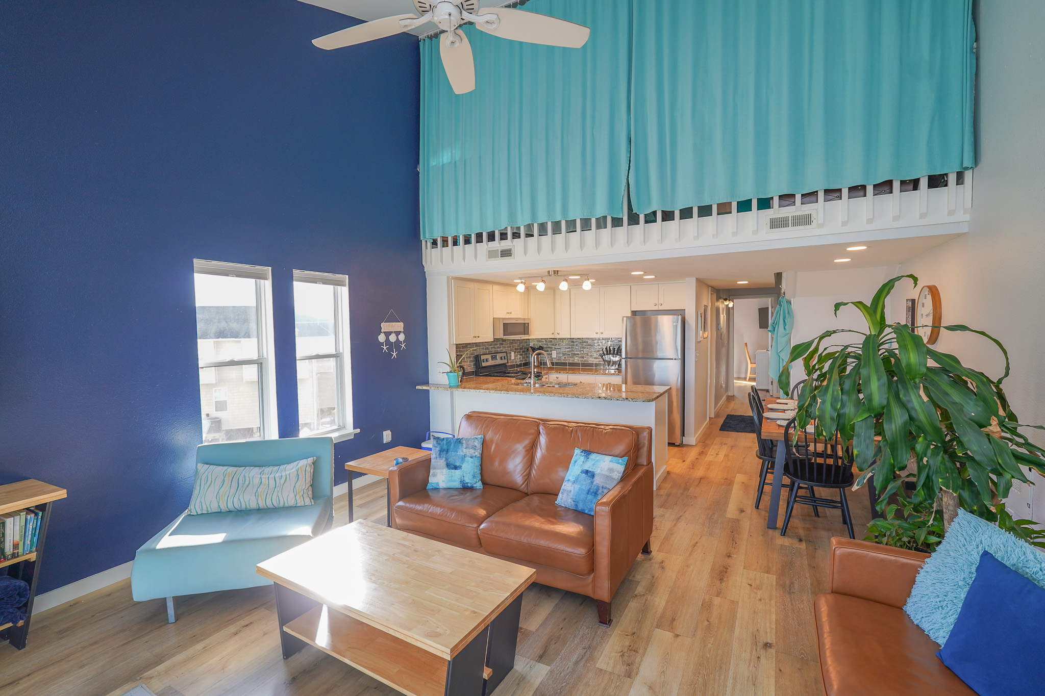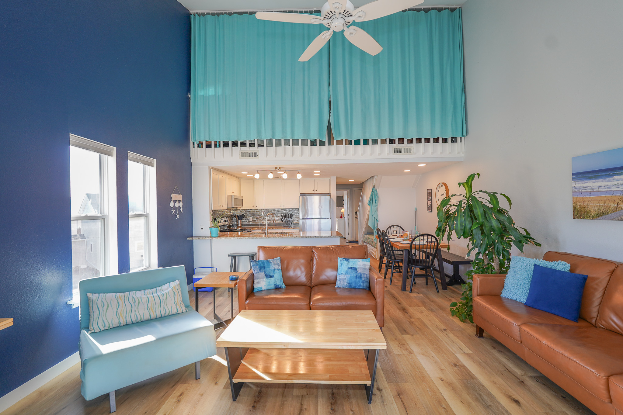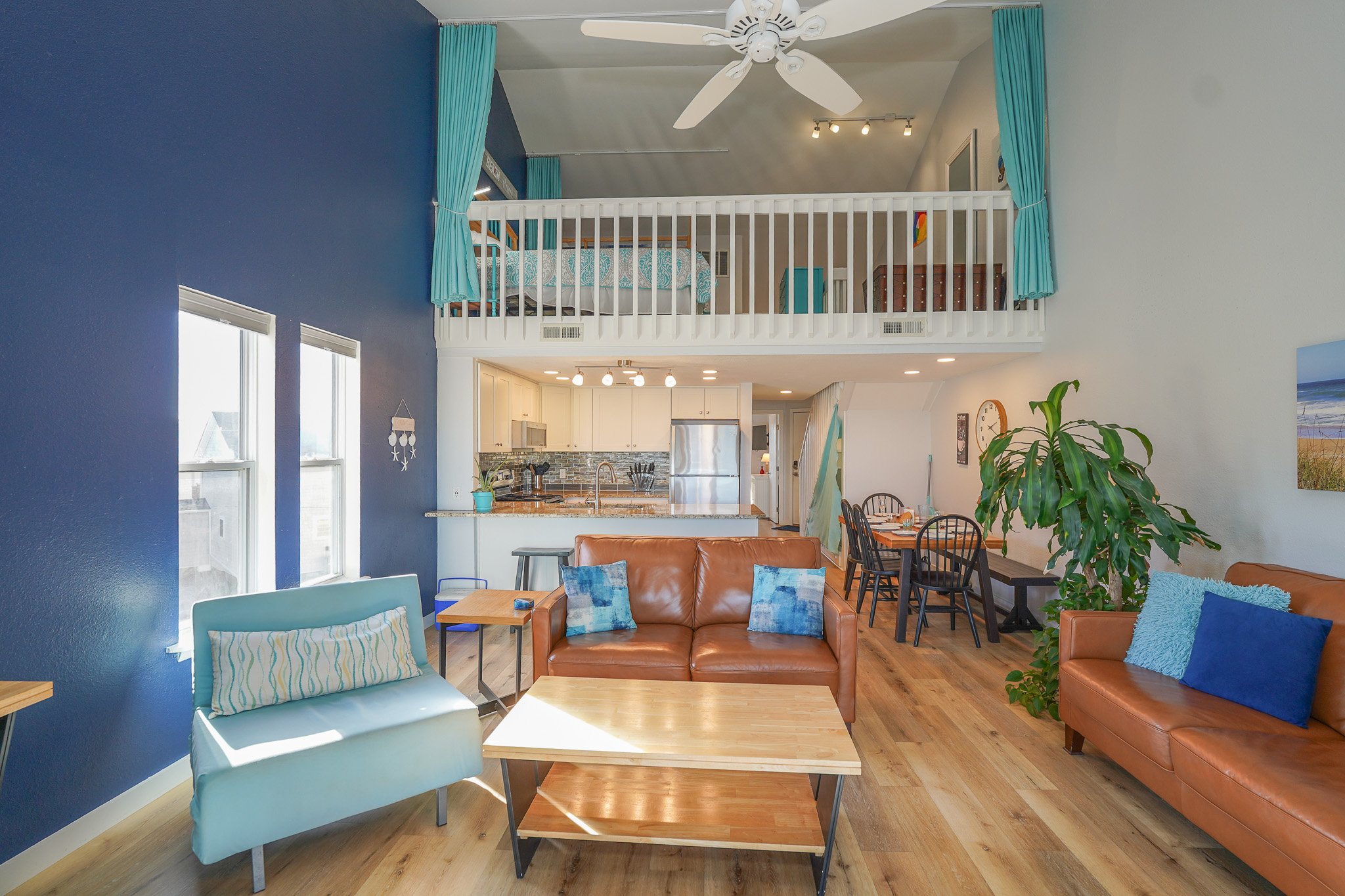 | 🌅 The View You'll love the amazing view from the third-story beachfront balcony overlooking both the beach and the ocean. Perfect for sipping morning coffee while enjoying the sunrise. | 🛏️ Loft Sleeping Area Comfy sleeping arrangements for up to four with memory foam mattresses on the queen bed and twin bunk beds. Sliding curtains offer privacy both for the loft and between beds. |