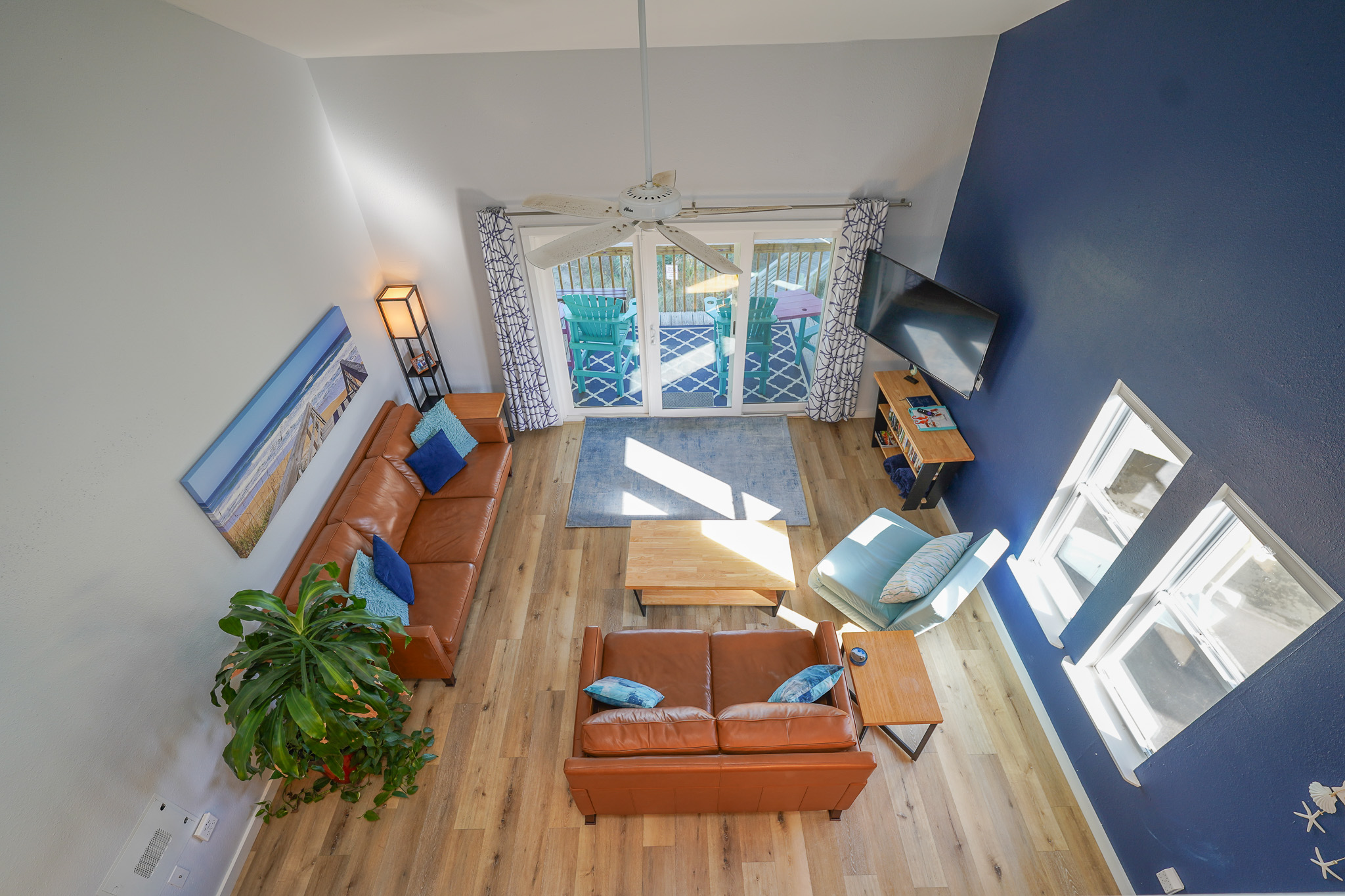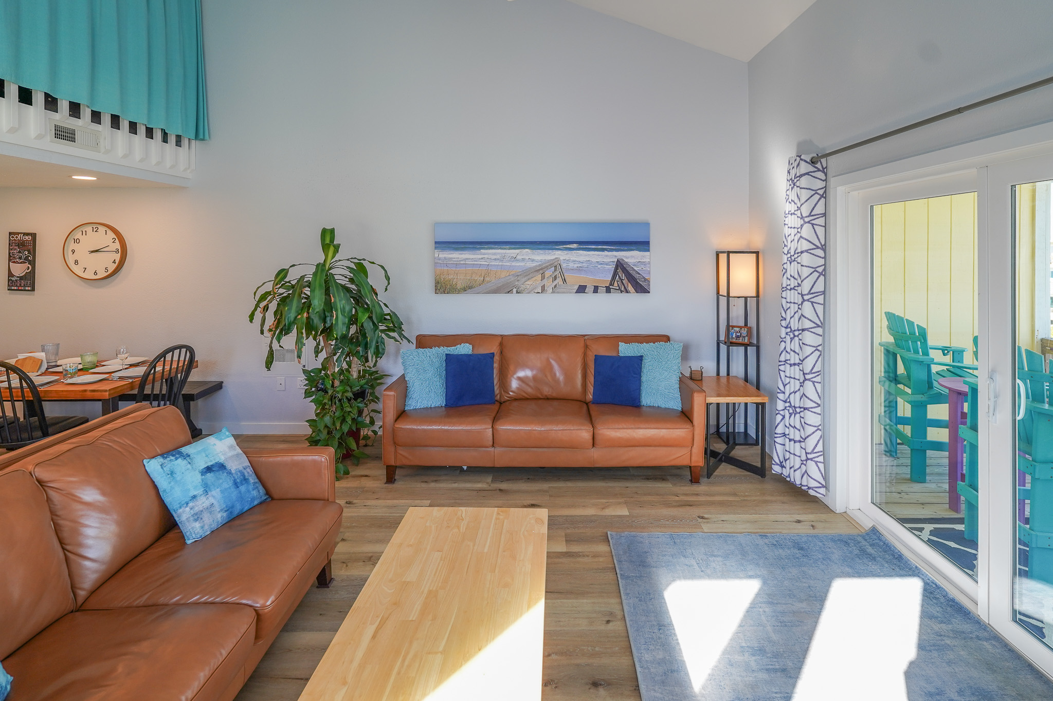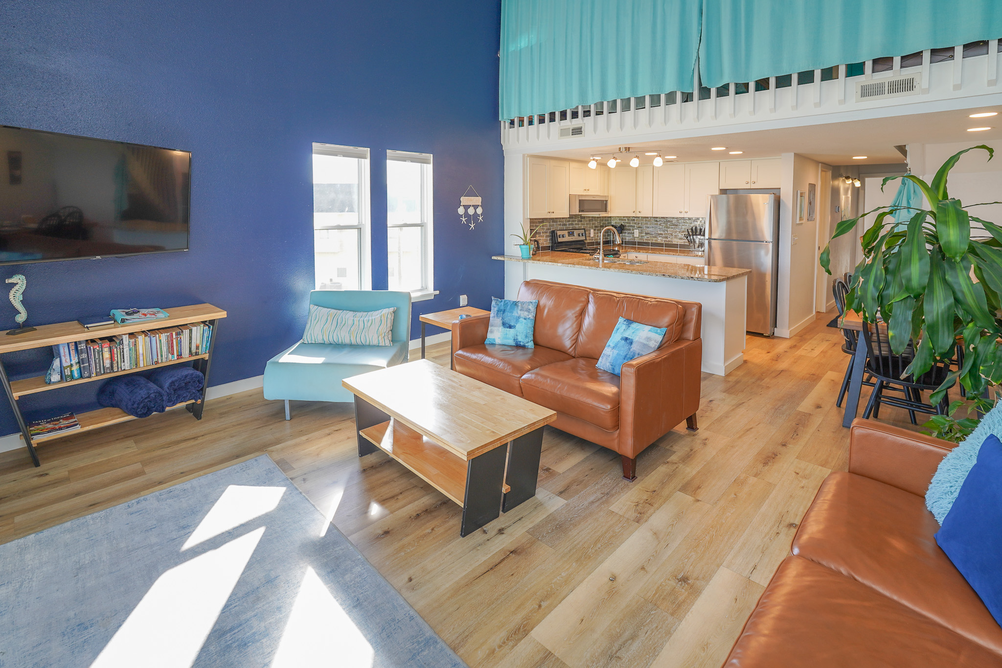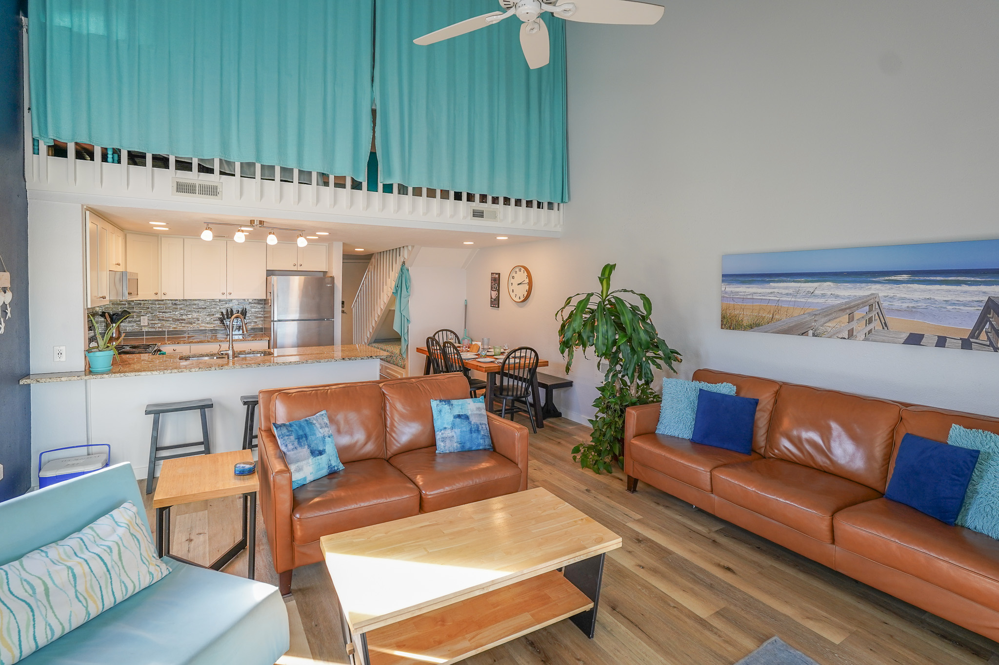 | 🌅 The View You'll love the amazing view from the third-story beachfront balcony overlooking both the beach and the ocean. Perfect for sipping morning coffee while enjoying the sunrise. | 🛏️ Loft Sleeping Area Comfy sleeping arrangements for up to four with memory foam mattresses on the queen bed and twin bunk beds. Sliding curtains offer privacy both for the loft and between beds. |
