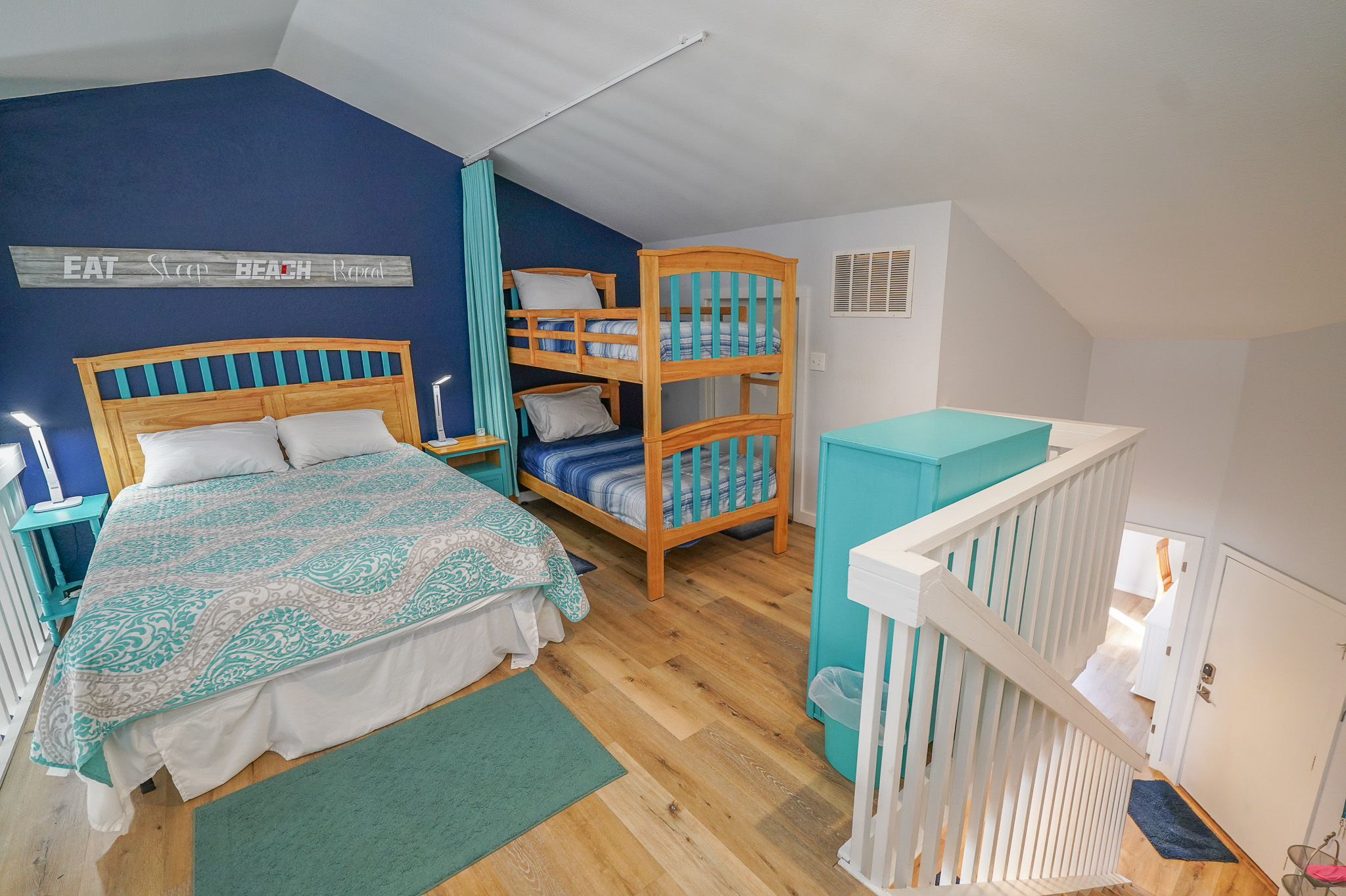 | 🌅 The View You'll love the amazing view from the third-story beachfront balcony overlooking both the beach and the ocean. Perfect for sipping morning coffee while enjoying the sunrise. | 🛏️ Loft Sleeping Area Comfy sleeping arrangements for up to four with memory foam mattresses on the queen bed and twin bunk beds. Sliding curtains offer privacy both for the loft and between beds. |