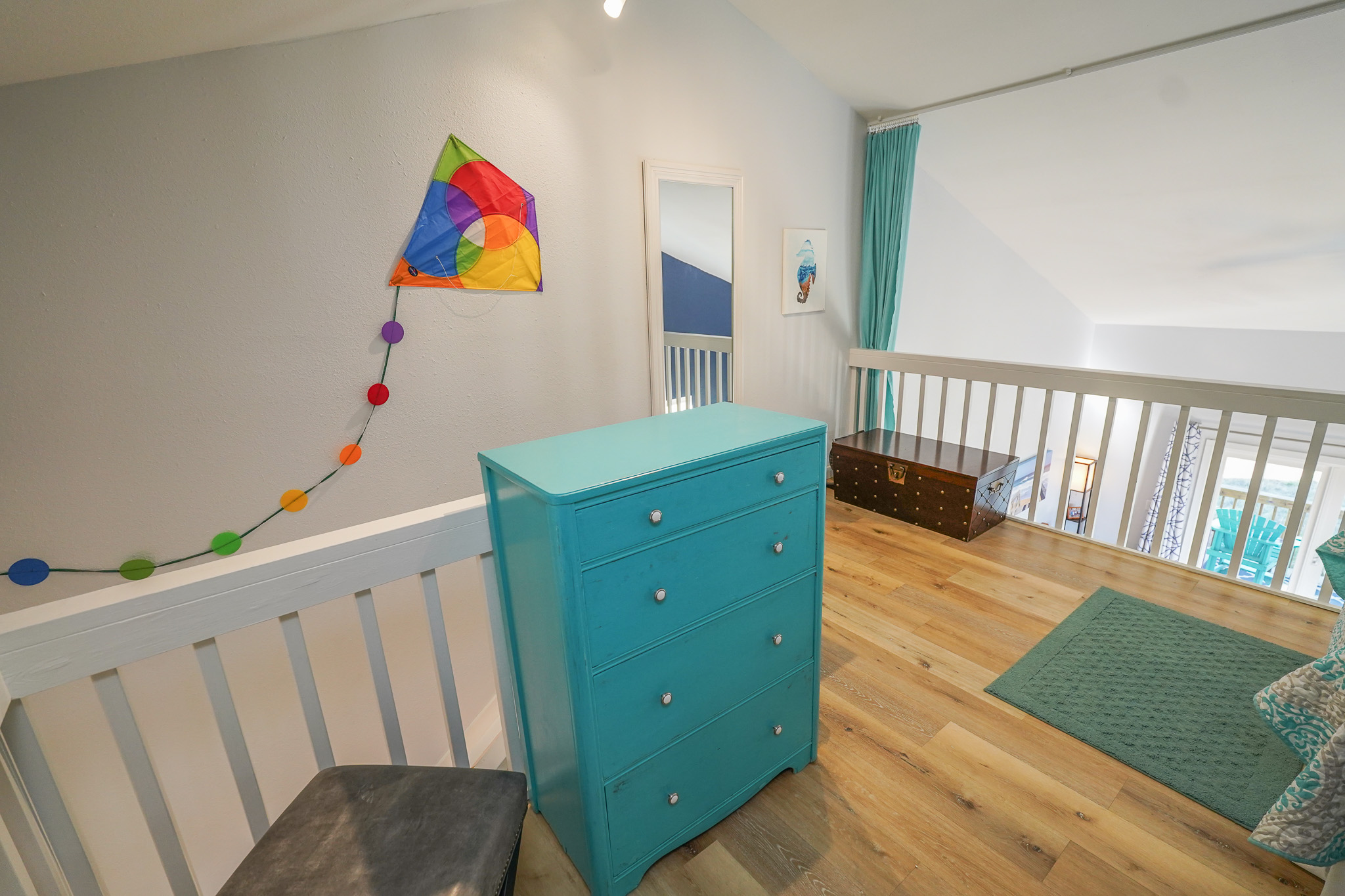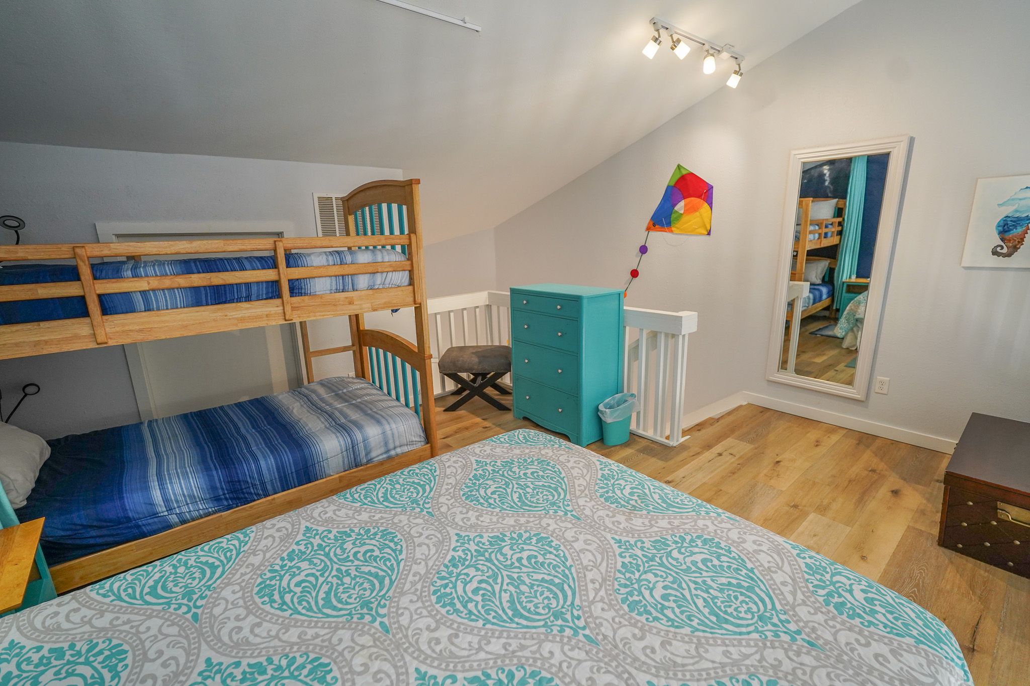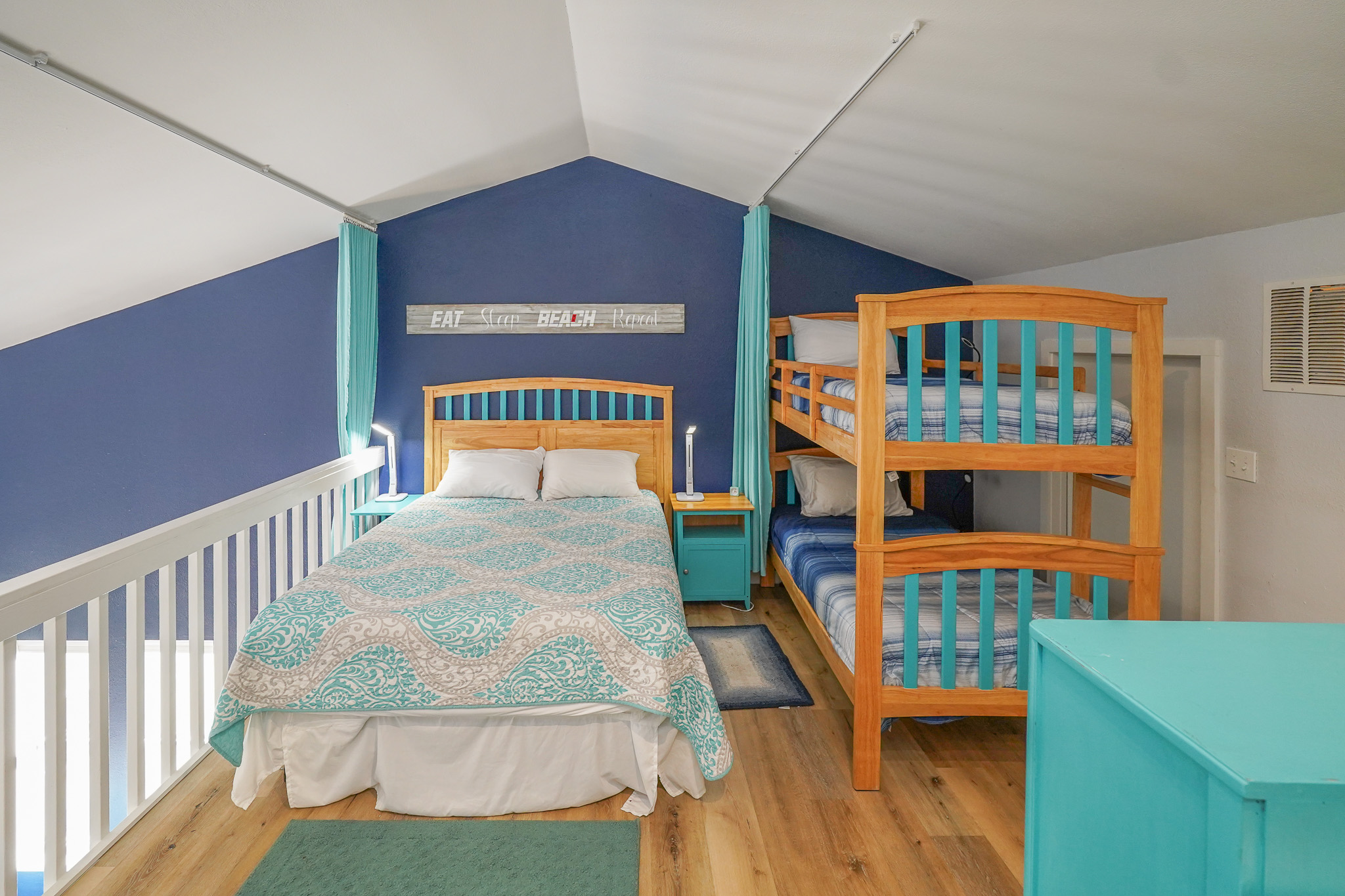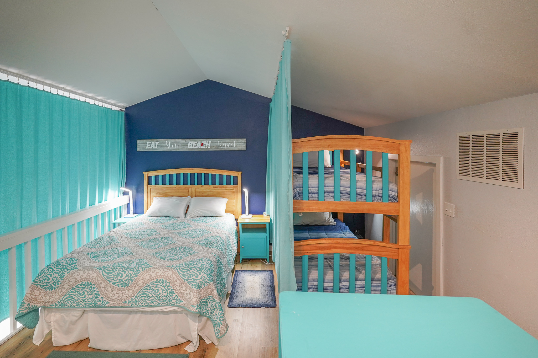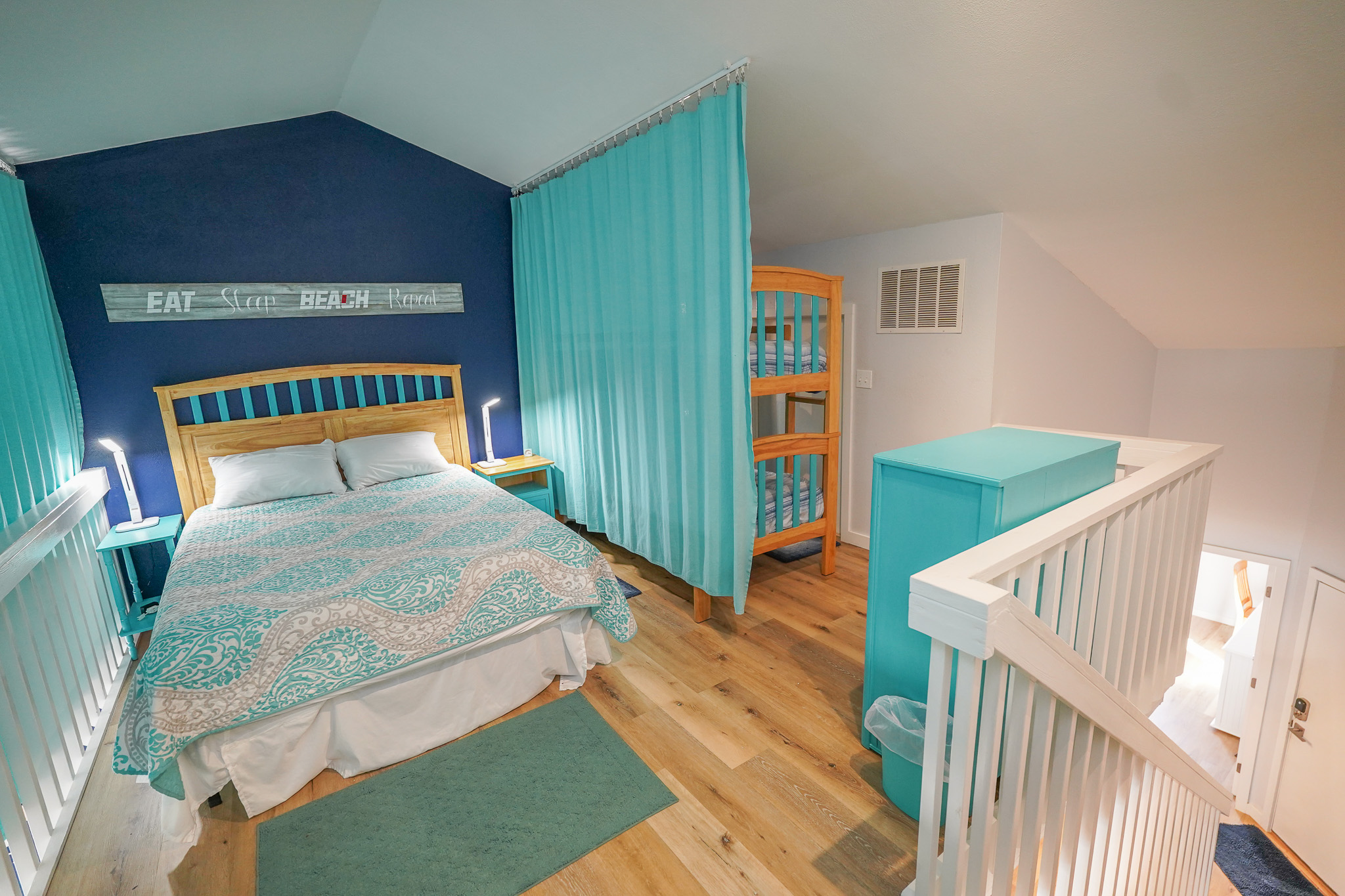🌅 The View You'll love the amazing view from the third-story beachfront balcony overlooking both the beach and the ocean. Perfect for sipping morning coffee while enjoying the sunrise. 🛏️ Loft Sleeping Area Comfy sleeping arrangements for up to four with memory foam mattresses on the queen bed and twin bunk beds. Sliding curtains offer privacy both for the loft and between beds.