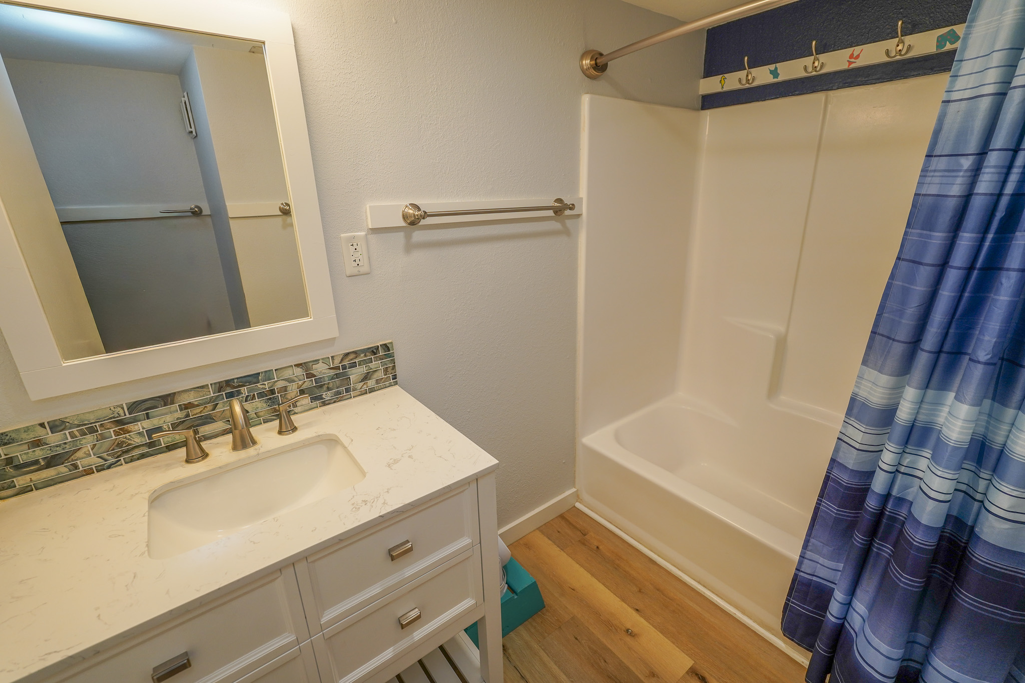 Total Sleeping Capacity: 8 guests | Bathrooms: 2 full bathrooms with showers, vanities, and extra hooks for wet swimsuits